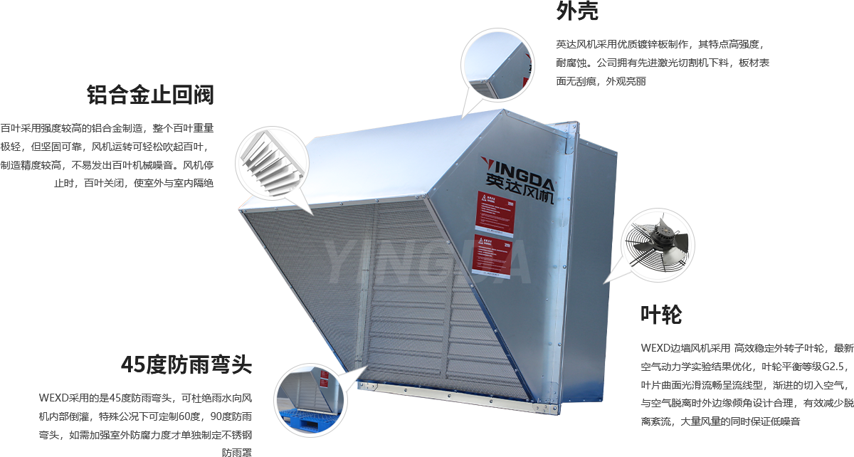 WEXD采用的是45度防雨彎頭,可杜絕雨水向風(fēng)機(jī)內(nèi)部倒灌,特殊公況下可定制60度,90度防雨彎頭,如需加強(qiáng)室外防腐力度才單獨(dú)制定不銹鋼防雨罩。