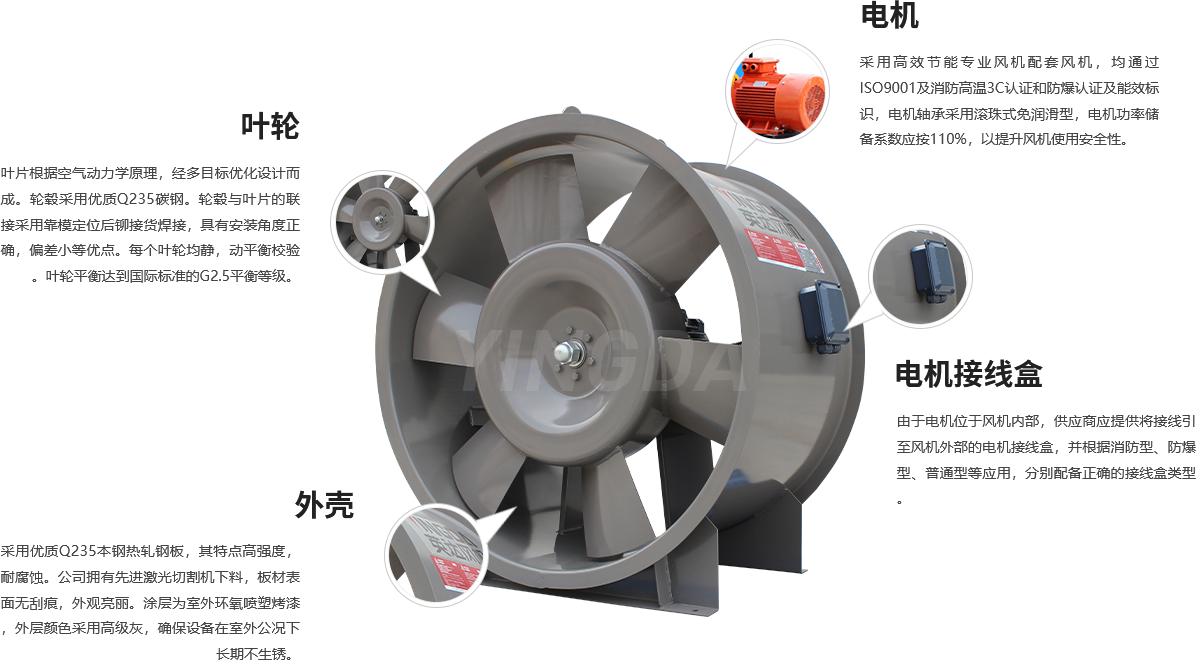 由于電機位于風機內部,供應商應提供將接線引至風機外部的電機接線盒,并根據消防型、防爆型、普通型等應用,分別配備正確的接線盒類型。