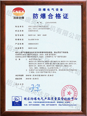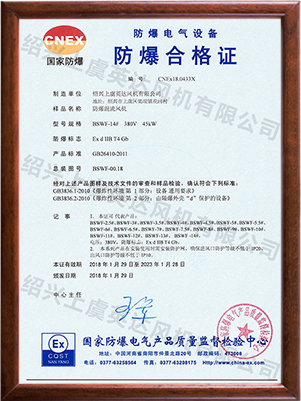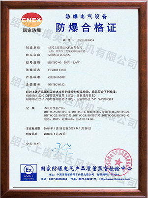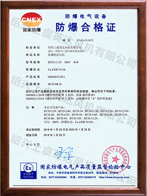 為適應(yīng)防爆環(huán)境需要,風(fēng)機(jī)可做成防爆風(fēng)機(jī),防爆等級(jí)為EXdⅡBT4,適用于易燃、易爆氣體的場(chǎng)所。整機(jī)通過國(guó)家防爆認(rèn)證。